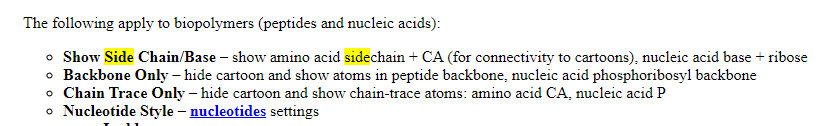 If the ribbon wasn't shown and you really wanted to show only the side chain atoms of the residue and NOT the backbone atoms, you would use the option to show side chain only.