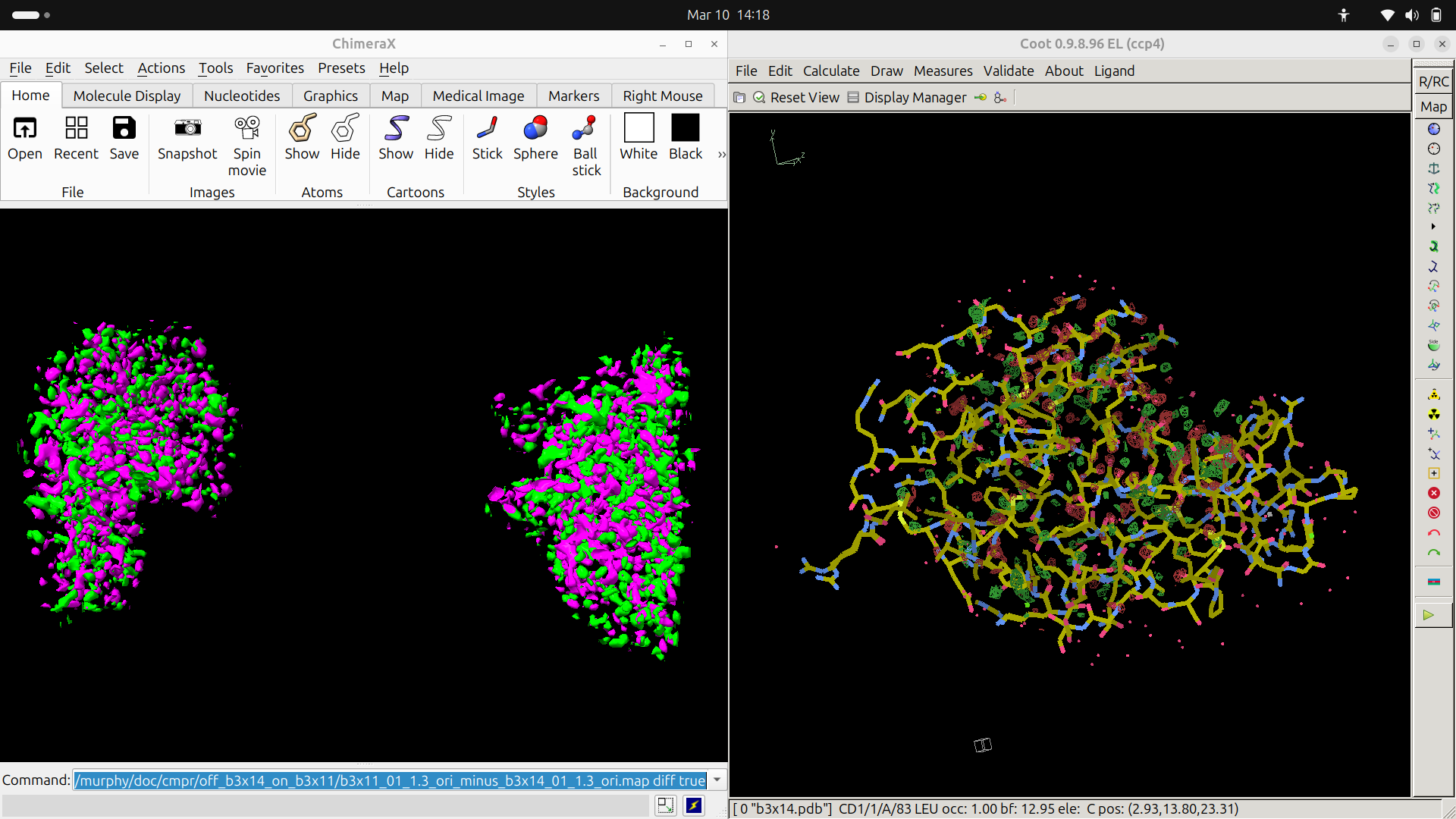 Hi, I generated a difference map using MatchMaps ( https://github.com/rs-station/matchmaps). However, when I load the map in ChimeraX, the density appears split into two distinct regions. Interestingly, this does not occur when the same map is opened in Coot, where it displays as expected. I have attached a screenshot for reference. Any ideas on how to “unsplit” the map or what might be causing this behavior? Thanks in advance.