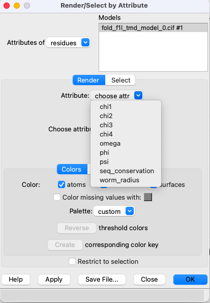 Hi Juan, The error in the file is that one of your values has quotation marks around it. Namely, this line in your defattr file: /A:10 "70 " If I edit it to remove the quotation marks and space so that it is just a number like all the other lines, then it works fine to assign your numerical attribute and it is automatically shown in the Render/Select by Attribute dialog. For the mailing list, I'm told that your address juan.ortiz-mateu@uv.es <mailto:juan.ortiz-mateu@uv.es> is not in the list, but maybe you are signed up with some other email address that gets forwarded? You would need to email chimerax-users-leave@cgl.ucsf.edu <mailto:chimerax-users-leave@cgl.ucsf.edu> from that other address that is actually the same as the one you signed up with, or let us know what that email address is. I hope this helps, Elaine ----- Elaine C. Meng, Ph.D. UCSF Chimera(X) team Resource for Biocomputing, Visualization, and Informatics Department of Pharmaceutical Chemistry University of California, San Francisco