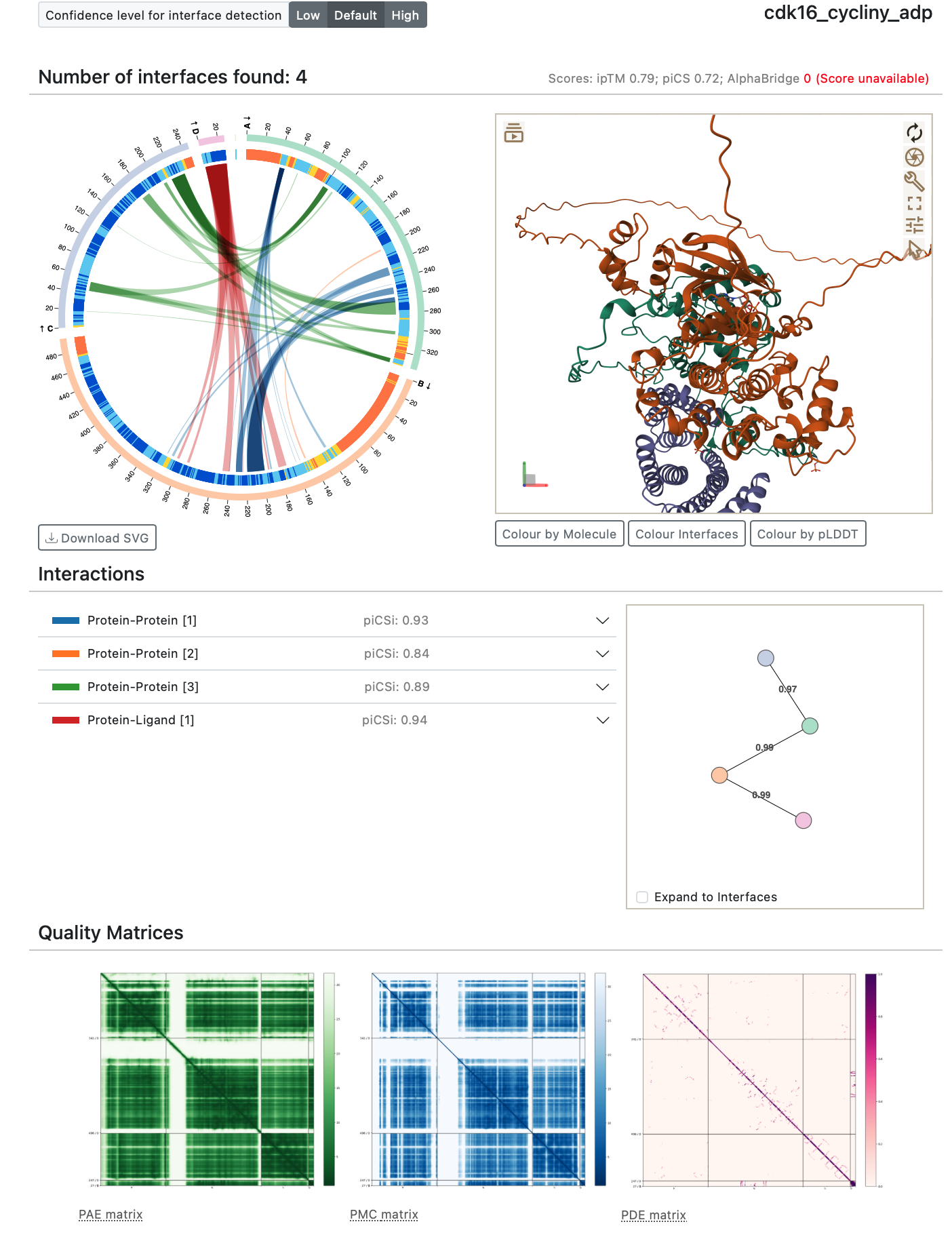 Hi Arun, As you have found out Boltz 2 and AlphaFold 3 organize their input and output files in different directories than AlphaFold 3. Since Alphabridge is designed to work with AlphaFold 3 and not Boltz it is not surprising that AlphaBridge won't work with Boltz. But it is not just the arrangement of files that is the problem. The actual data output by Boltz aside from the mmCIF structure file uses different formats. Boltz for instance puts its PAE and PDE per-residue-pair confidence data in a numpy .npz file while AlphaFold 3 uses .json (at least last I used it). Also the confidence metrics like ipTM in Boltz are in a json file that is different from what AF3 provides. The pLDDT scores are in the b-factor column (and also an mmCIF scoring table I think) in both AF3 and Boltz 2 output so Alphabridge would be able to access those. In short, it would take more than just rearranging files, some would probably have to be put in different formats to work with Alphabridge. Maybe someone has already done that, you could ask the Alphabridge developers. ChimeraX could do it if we had time to implement it. But I'd be more inclined to just add directly into ChimeraX the Alphabridge plots so you don't need to go to a web server. Could you tell me which specific plots you like from Alphabridge? Is it the circular residue-residue interaction plot that colors by different interfaces that you like? (Example image below.) Tom